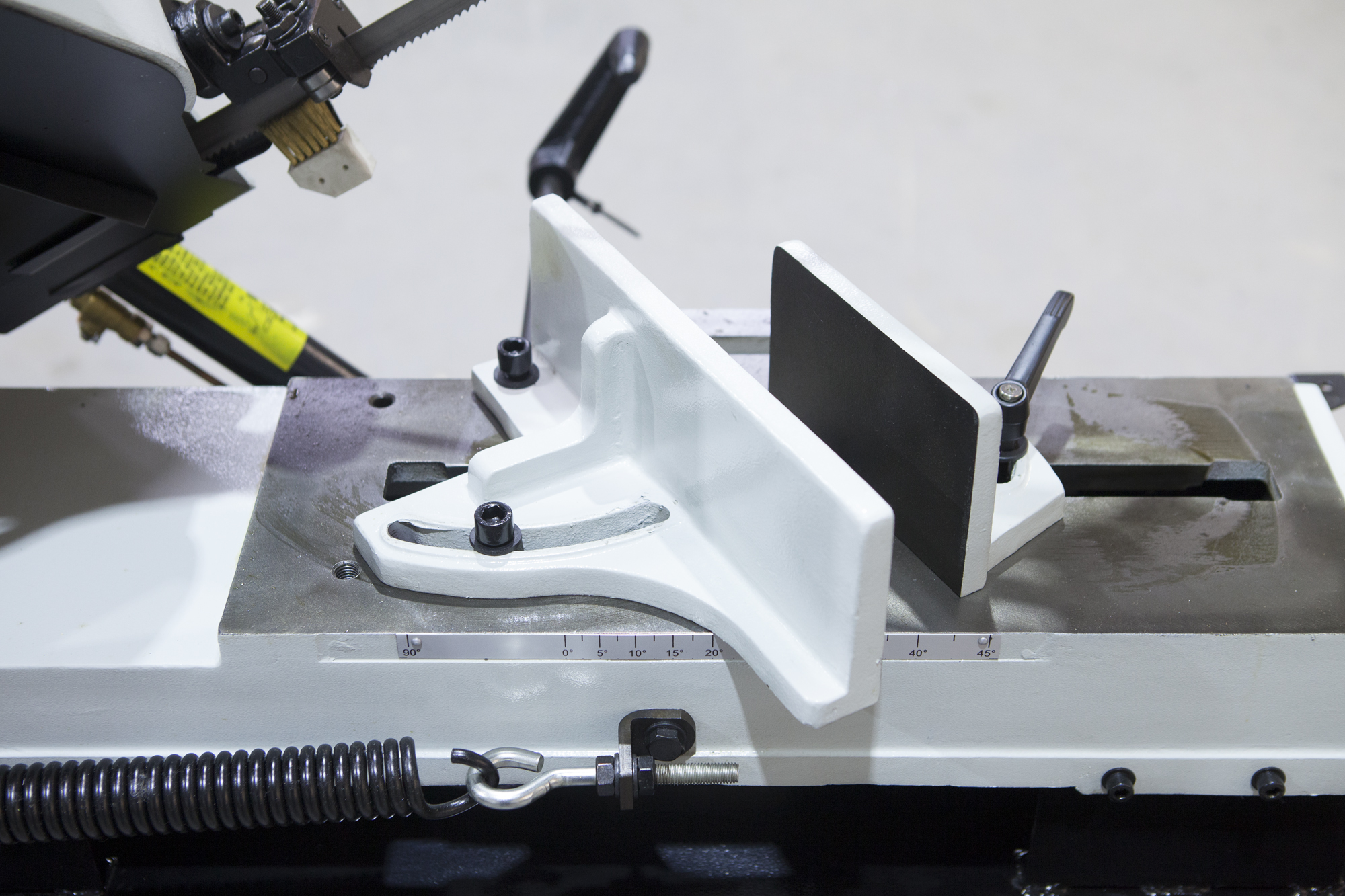 На станках с гидроразгрузкой управление и процесс резки (запуск пилы – опускание рамы – остановка пилы) происходит за счёт запуска двигателя и регулировки гидроцилиндра. Гидроцилиндр имеет переключатель вкл./выкл. гидравлической системы и плавную регулировку опускания рамы верхним маховиком на дроссельном клапане.